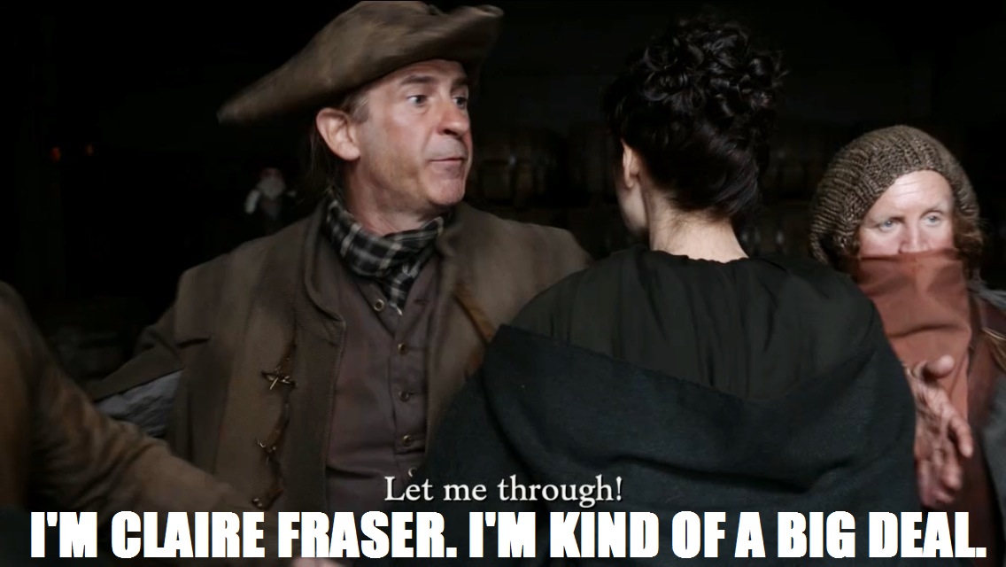 Look, she was just going for a walk. Except that Claire always gets into the most trouble ever when she goes for walks. What I loved most about this scene was how Jamie was calling her name and chasing her while she darted away from him like my dog does when he steals a loaf of Italian bread. (It happens.) She even managed to sneak past the guy who was keeping everyone else out. How? Because she’s Claire Freaking Fraser. Which she boldly told le Comte St. Germain. (I would have gone a different route. I would have been like, “My name is Laoghaire MacKenzie. Send any ill wishes you have for me straight to Castle Leoch, Scotland. Thanks!”)
