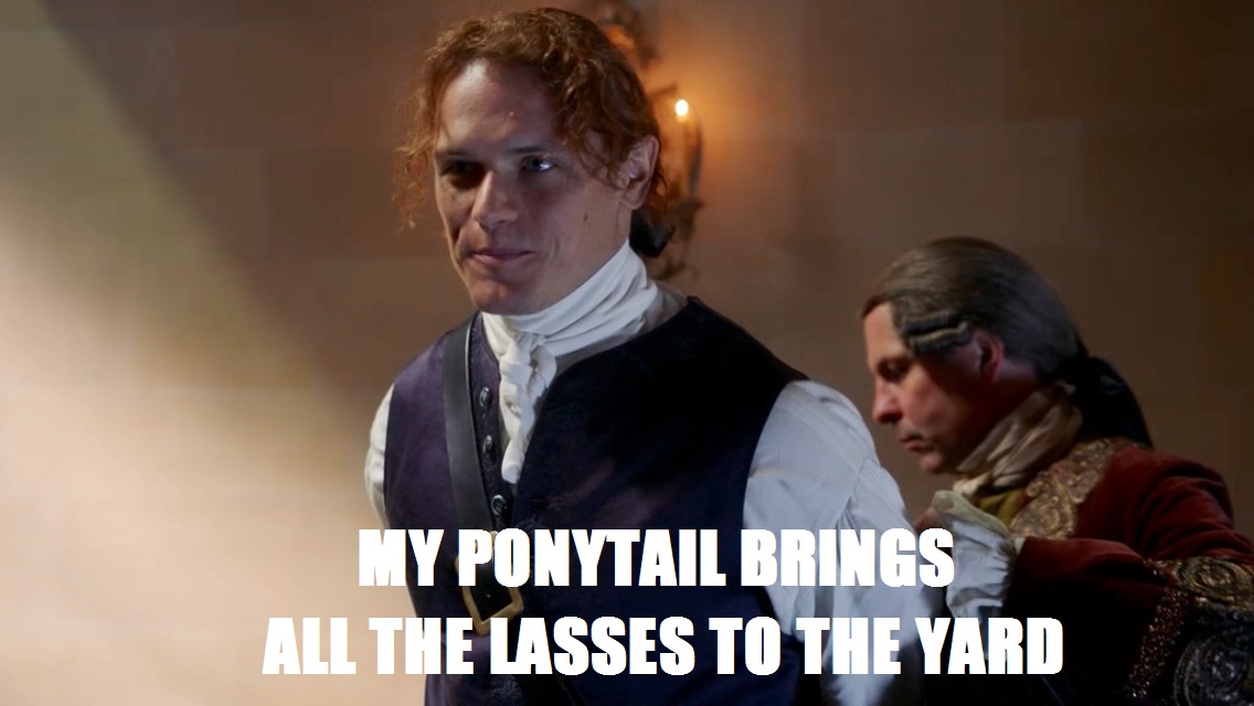 Confession time: I have a huge weakness for a man bun, and Jamie’s ‘do in this week’s episode was pretty much the 18th century equivalent. The man is to die for in his ponytails. He looks so refined, but almost like he’s not comfortable being so refined and can’t wait to rip the ribbon out but he won’t because, you know, court, fancy France, high society, etc. etc. That gorgeous ginger tail has got to be the sexiest thing to hit Versailles in centuries, and I’m pretty sure it was a big reason why Annalise could not keep her hands off of him. When you put that red mane up against all of the powdered wigs, is there really any competition?