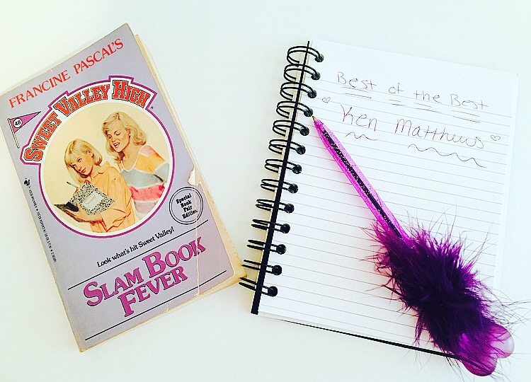 I remember these books. I started with Sweet valley twins and moved on to Sweet valley high. I had all the old ’80s covered books. I clearly remember the slam book fever cover and book. I was such a dork in the sixth grade that I tried to write my classmates names down on a piece of paper and then rate them like the book and that’s as far as it went. No one cared what I was writing and a lasting about 3 minutes and was done.