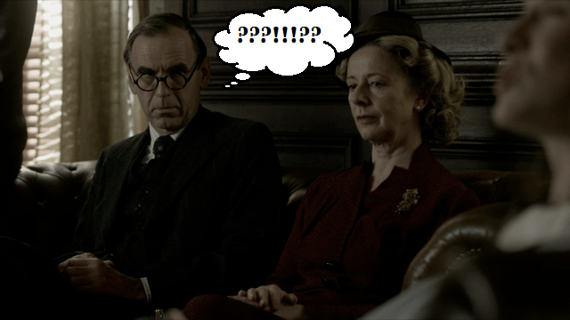 You know, I thought it would be tough to be a woman in 1745, but the 18th century has nothing on the male chauvinists hanging out in 1948. Even Dougal MacKenzie, Corn Grinder Extraordinaire, looks like Prince Charming next to Frank’s dean at Harvard. Seriously, is this guy the actual worst or what?