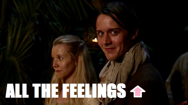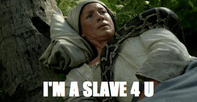What say you, fellow Fraserites? Did you love having a front row seat to the wedding of the year? Would you be as cool and collected as Claire with a snake crawling on you? ARE YOU CONCERNED ABOUT THE IMPENDING DROUGHTLANDER? Let me know! And don’t forget to come back for more Outlandish fun when we discuss “The Bakra.” Full disclosure: I am very excited about seeing Wee Ian again, less excited about this look on JAMMF.