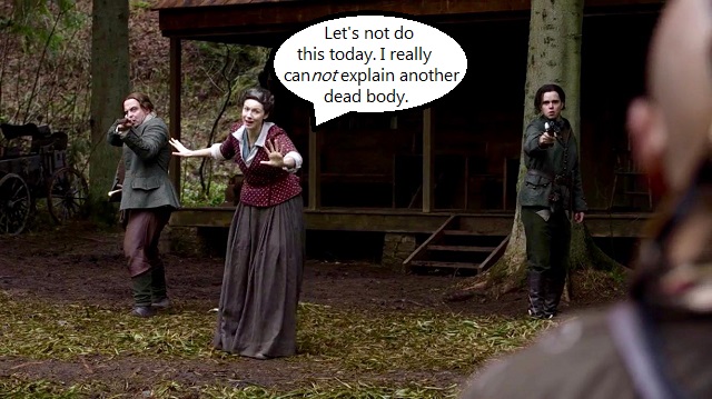 I love that Claire gets right in the middle of the Muellers and the Cherokee and gets both sides to put down their weapons. I’d say it has 50% to do with her skill and 50% to do with being the wife of Bear Killer.