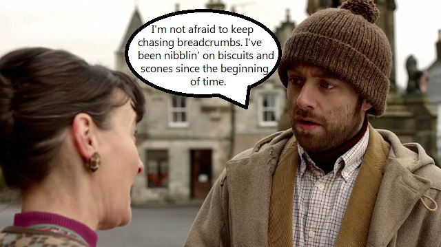 Fun fact: Every time I fold a batch of laundry, my dog steals something and runs under the bed with it. I feel like that is the white sow’s M.O. also. The real question is: How did she get Jamie’s tricorne without him even noticing? Maybe we should put Detective Rog on this case.