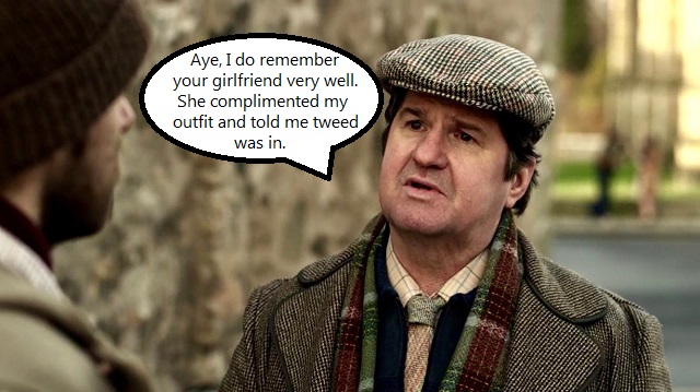 Detective Roger Wakefield is on a mission to find the girl he loves, and he is not afraid to trace her steps and grill everyone she may have had contact with, like this kindly cabbie who is wearing more tweed than I’ve ever seen in my life.